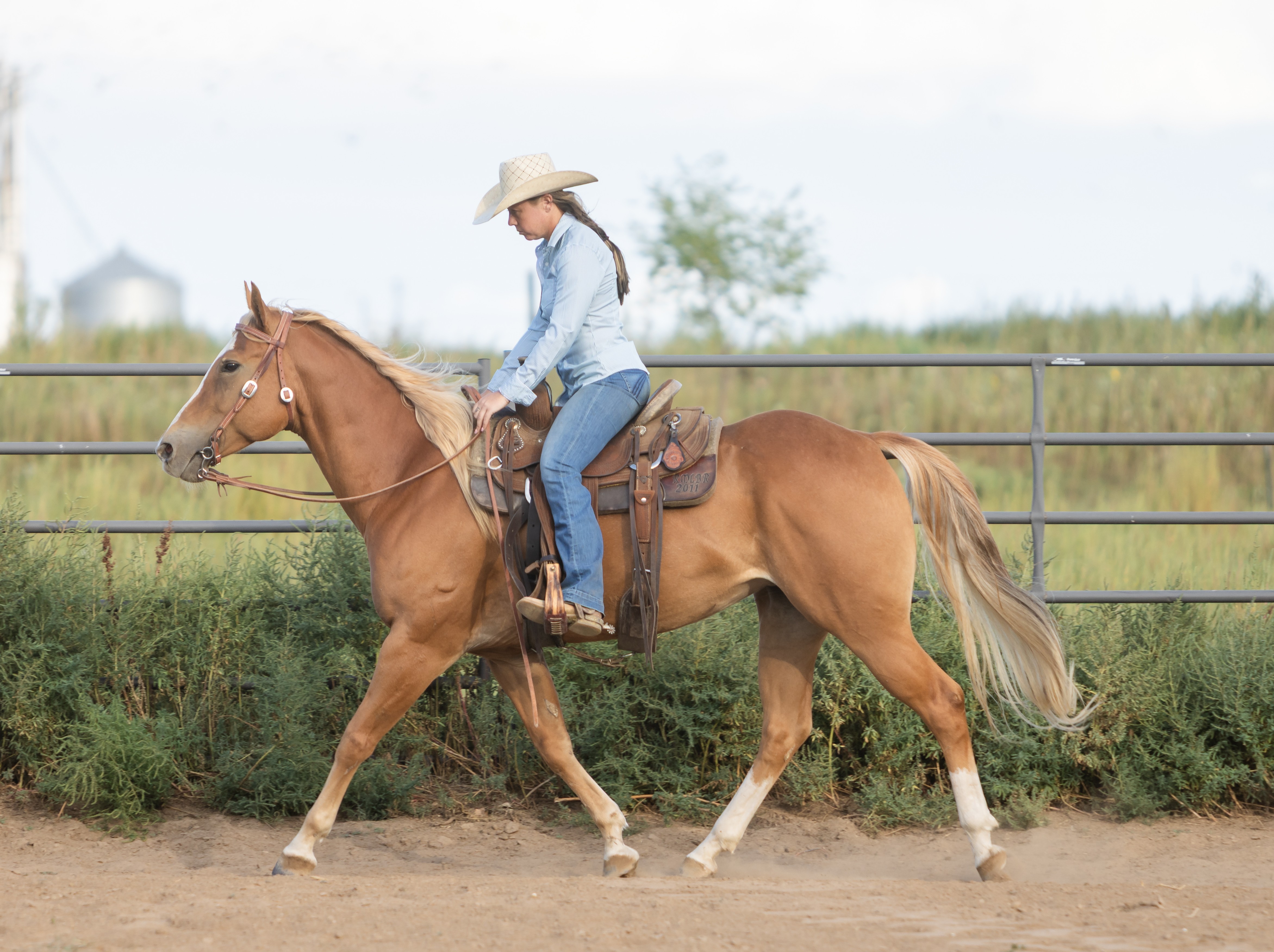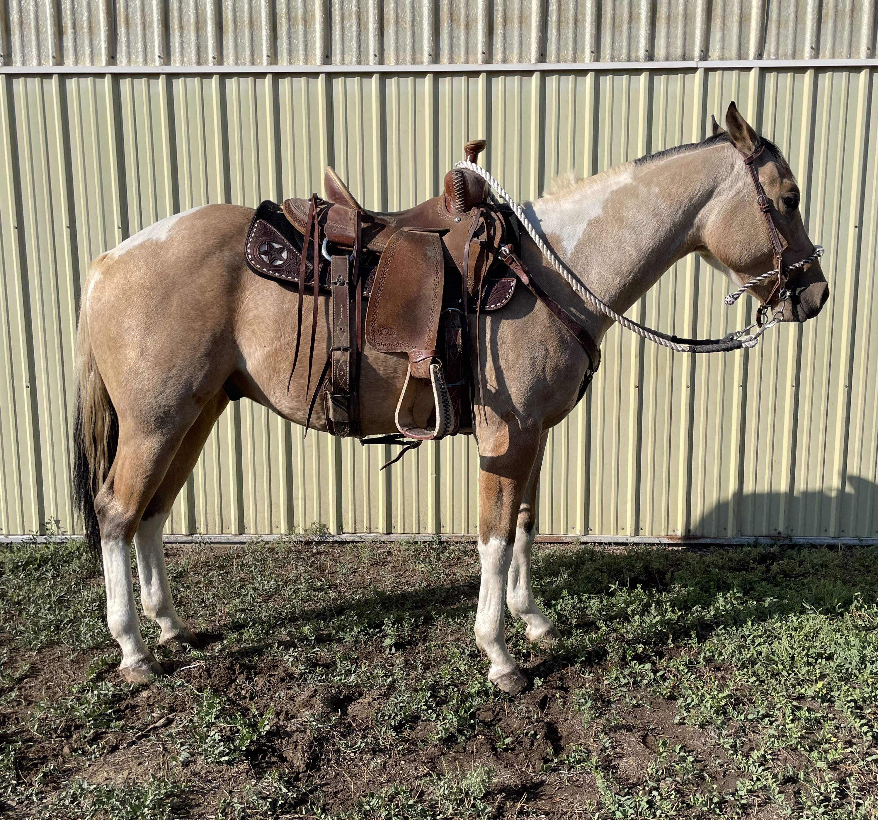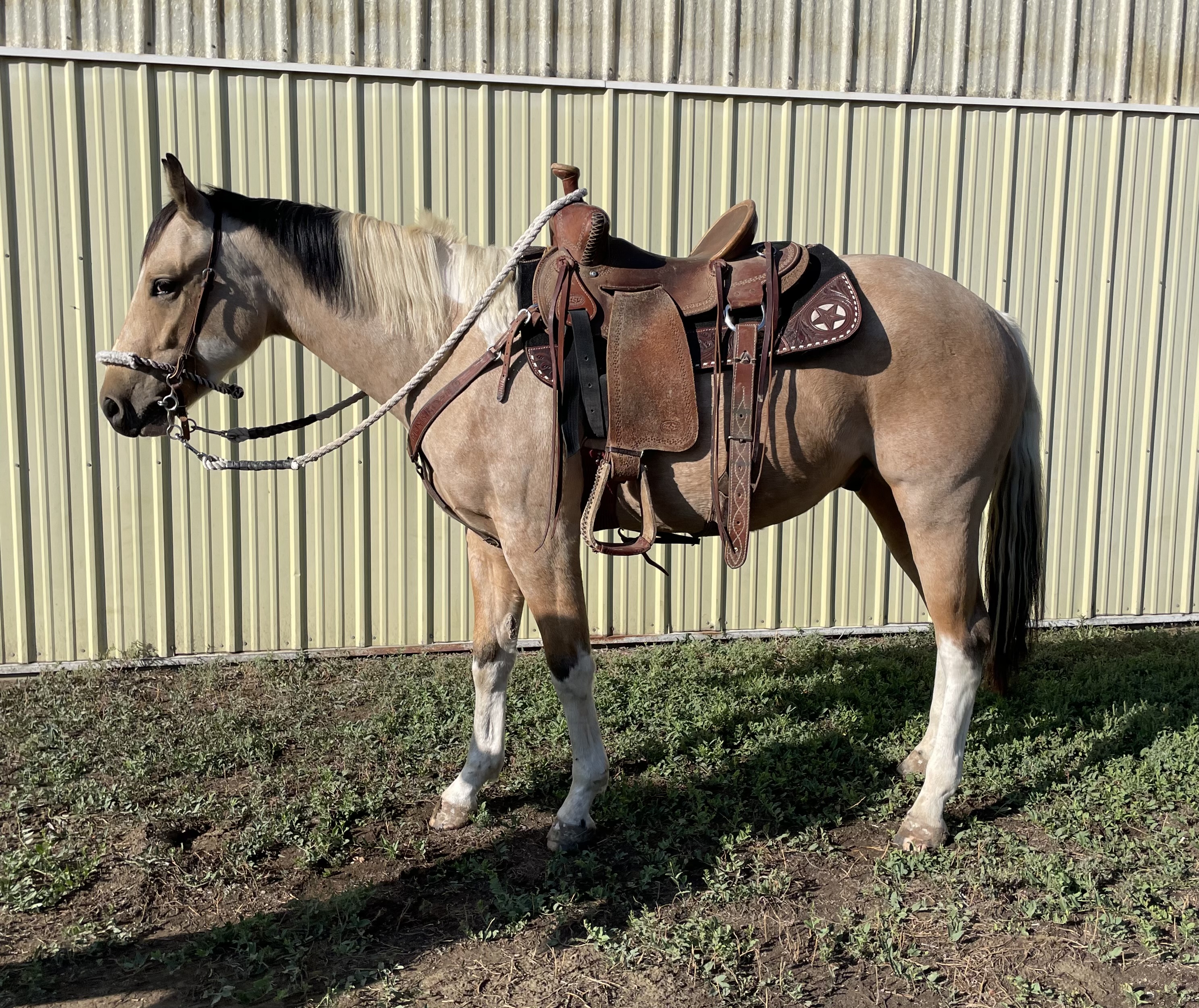 | HIP# 31 Palomino Tobiano APHA Gelding ![]() ![]() "Geronimo" - 9 yr. old Palomino Tobiano APHA Gelding. He is Beginner broke to ride. Geronimo is one that will stand out in the pasture. He has been the kids' favorite trail horse for years. Very gen ... | HIP# 32 Palomino AQHA Mare ![]() ![]() CAJUN DOVE "Dove" - 4 yr. old Palomino AQHA Mare with a show stopping mane and tail. She is going strong being rode on the ranch and in the feedyard. Has a really good start and we think that this sha ... | HIP# 33 Palomino AQHA Mare ![]() SKIPPS COTTON WILL "Pumpkin" 8 yr. old Palomino AQHA Mare, standing 15 hand with a solid foundation and a good start on ranch work. She’s been used to ride and pack in the mountains the past few sum ... |