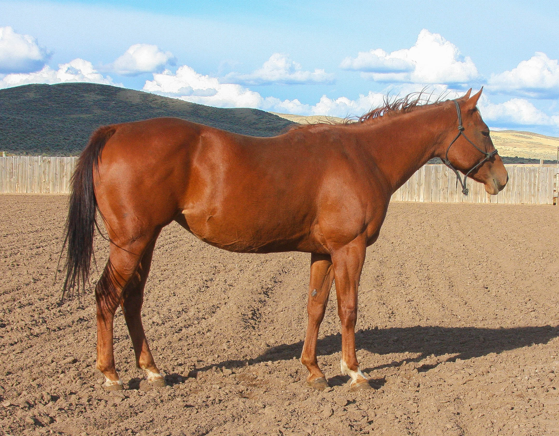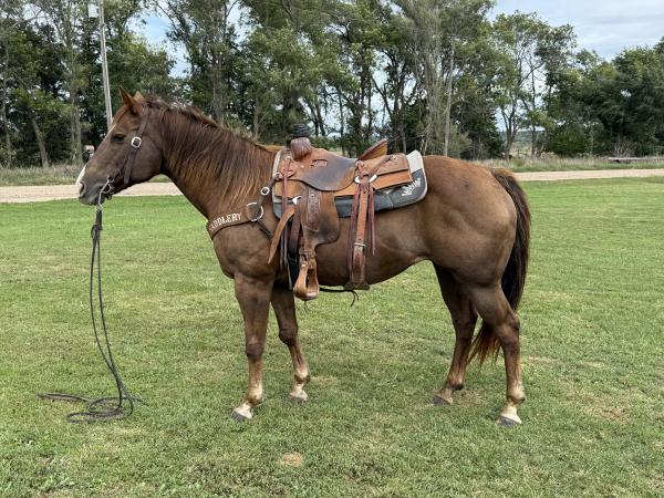 | HIP#21 Bay AQHA Mare ![]() STYLISH LANEY - 17 yr. old Bay AQHA Mare. She has done it all from Grand Entry to RSNC world finals and everything in between. She is kid friendly and traffic safe. Laney is very cowey and has done pl ... | HIP# 22 Sorrel Quarter Horse Gelding ![]() "Roscoe" - 18 yr. old Sorrel Quarter Horse Gelding with plenty of experience. He’s been used for ranch work, in branding pens, on trail rides, both packed and ridden. Gentle, dependable, and level-h ... | HIP# 23 Sorrel Quarter Horse Mare ![]() ![]() "Rocky" 17 yr. old Sorrel Quarter Horse Mare. She is broke to ride & been packed on in the mountains. She has also been used as a broodmare, and she is very gentle. Consigned by: Thomas Stutzma ... |