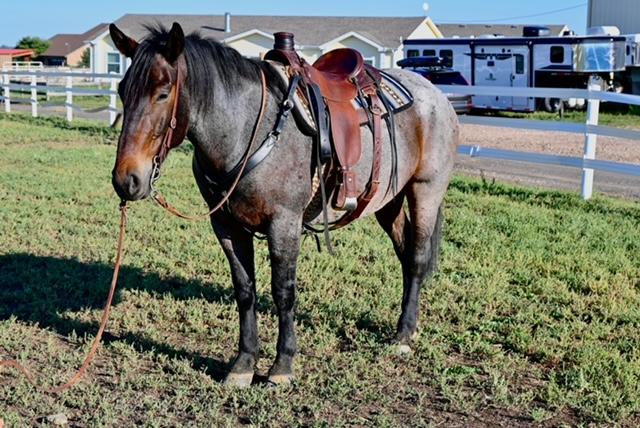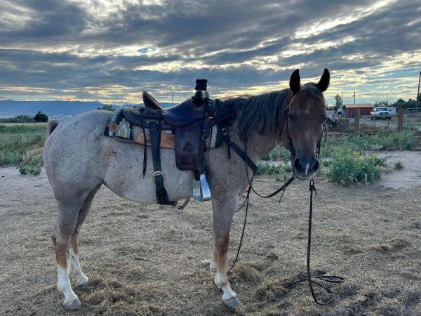 | HIP# 49 Grey AQHA Mare ![]() BFR BLU MY SPARKPLUG "Fetty"- 13 yr. old Grey AQHA Mare. She can do anything you ask of her. She’s been roped on, ranched on, works cattle, trail riding, she does it all! Stands for farrier.Very swe ... | HIP# 50 Red Roan AQHA Mare ![]() ![]() SURPRISE MARY - 15 yr. old Red Roan AQHA Mare.A safe kids horse and great for any level of rider. A fantastic babysitter. Mary knows what kind of rider gets on and adjusts to them.