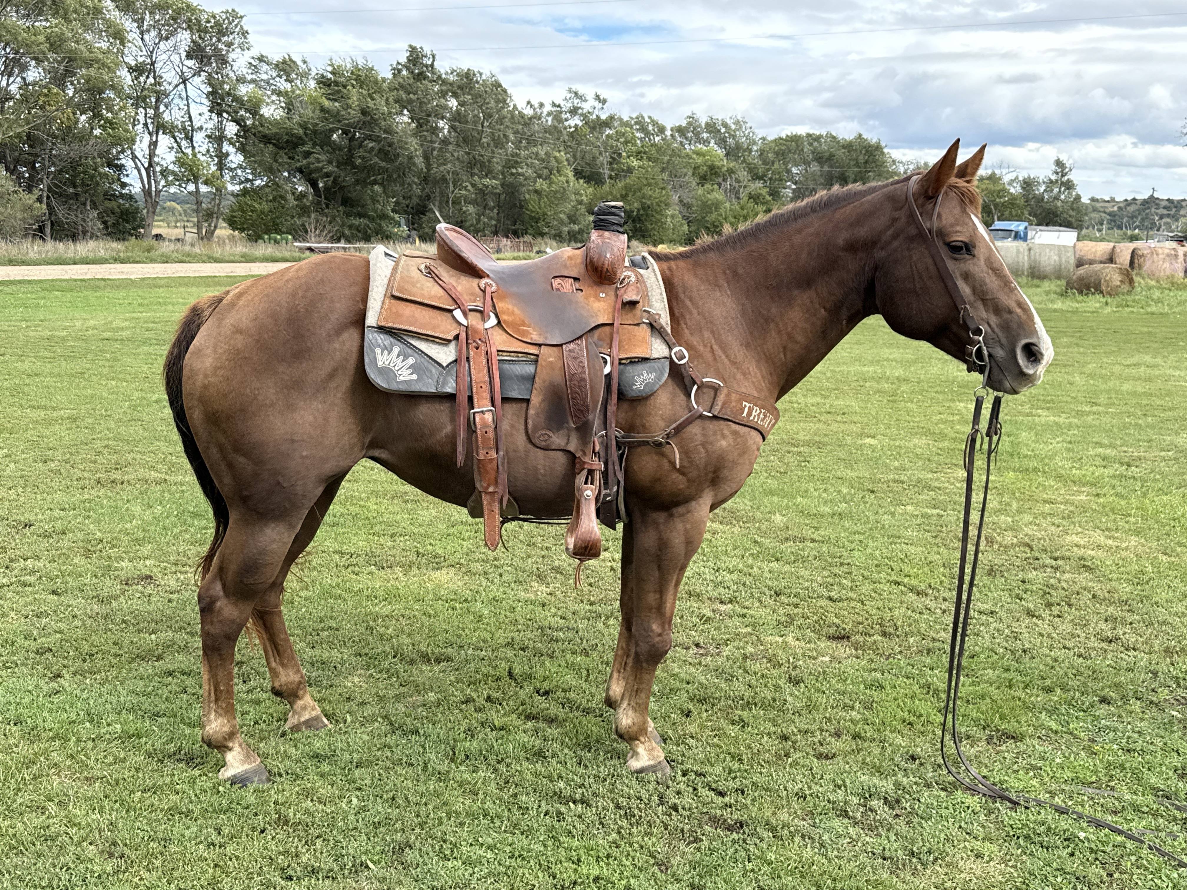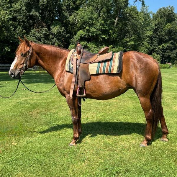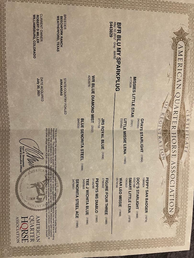 | HIP# 46 Sorrel AQHA Mare ![]() SHEZA FREIGHTLINER "B" 9 yr. old Sorrel AQHA Mare. B is a daughter of the great “Freighttrain B” and out of a Royal Shake ‘Em mare. She stands approximately 15.1 with great foot and bone that ar ... | HIP# 47 Grey Quarter Horse Gelding ![]() ![]() "Flynn" 11 yr. old Grey Quarter Horse Gelding. Flynn is a trail horse with a smooth gait & very friendly. We purchased him for our Grandsons, and they can crawl around on him but need a little more ex ... | HIP# 48 Chestnut Foxtrotter Gelding ![]() "Storm" 17 yr. old Liver Chestnut Missouri Foxtrotter Gelding. Can move like a cat. Has been on trails & in the arena. He's to much cat for me. Storm is not a beginner's horse. He loads good, good for ... |