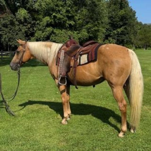 Been used for tra ... | HIP# 51 Palomino Quarter Horse Mare ![]() "Honey Bee" 14 yr. old Palomino Quarter Horse that stands 14.3 hh. Eye catching mane and tail. She rides with smooth, steady gaits, western and english, with a reliable walk, trot, and canter. She res ... |