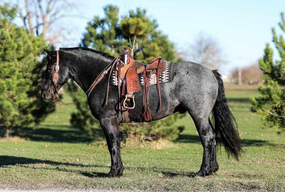 "Gambler" 6 yr. old Blue Roan Draft Crossbred Gelding. He is broke to ride & drive and stands 16 h.h.