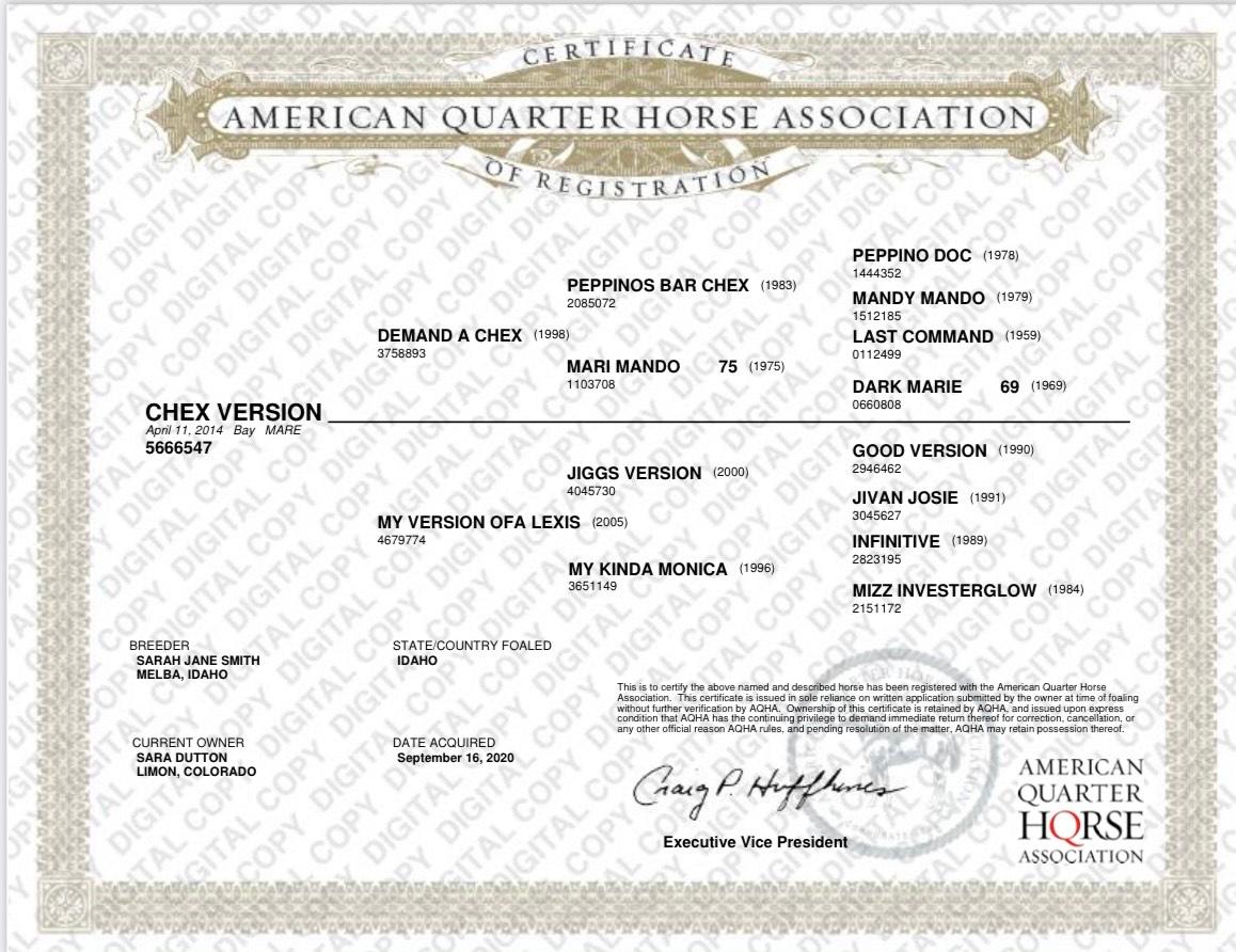 CHEX VERSION "Cha Cha" - 2014 Bay AQHA Mare. Cha Cha is big, pretty, and gentle. Stands 15.3hh and approximately 1,300 lbs. She runs 3D/4D barrels, gathers and sorts on the ranch, and has worked penni ...