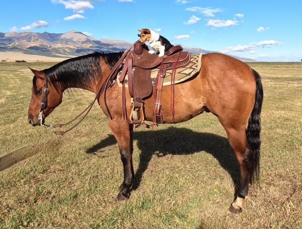 "Oscar" - 2018 Buckskin Quarter Horse Gelding. Oscar is family-friendly and gentle gelding that stands 15hh. More whoa than go. He has been used on the ranch trailing cows and checking fence. He is ea ...