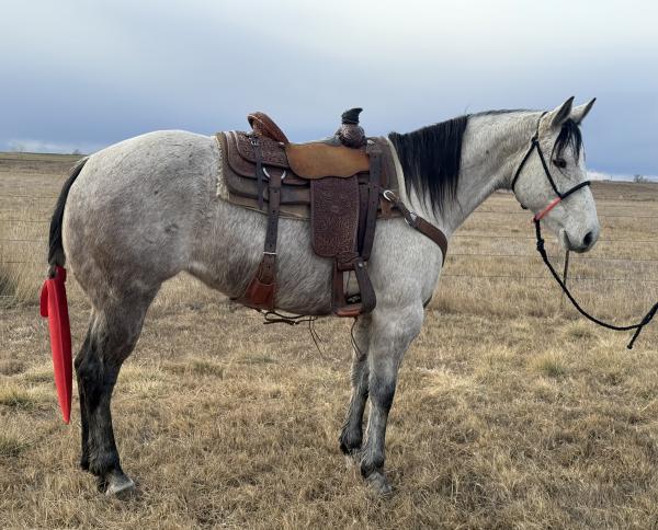"Chip" 2022 Gray Quarter Horse Gelding standing 14.2 hands tall. He is no stranger to a long day on the ranch or in the feedlot. Nice all around young gelding that has endless potential.