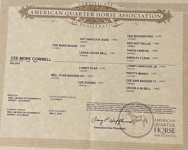 CEE MORE COWBELL "Cowbell" - 2018 Gray AQHA Mare. Cowbell is a finished head horse and stands 15.1h. Cowbell is a mare that my family bred and raised. She has been used in the feedlot, gone to brandin ...