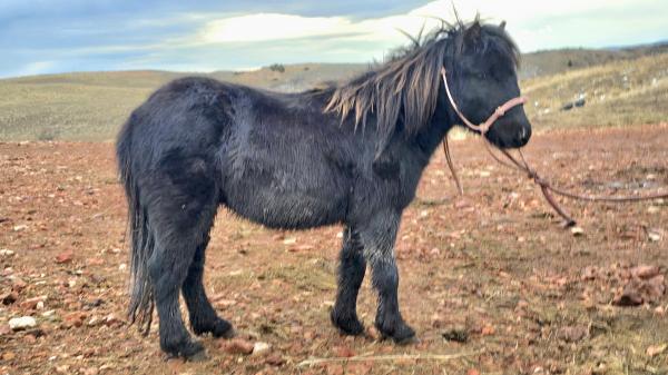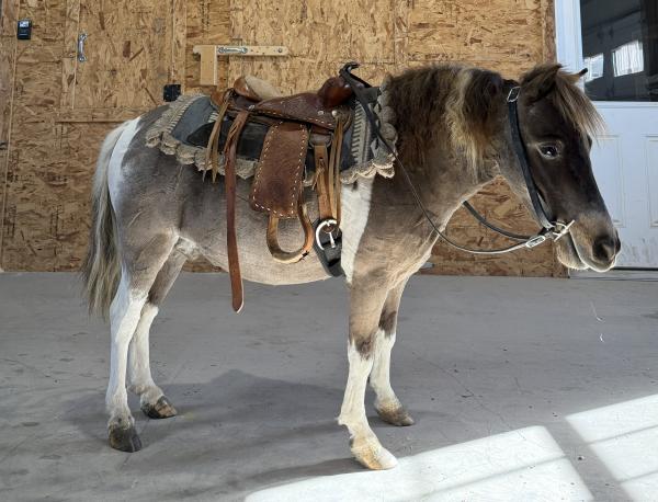 "Lakoda" 2023 Grulla Paint Pony Gelding. He is 33" tall, very well trained to ride and drive and lays down on cue. Lakod ... | HIP #11 Blue Roan Draft X Gelding