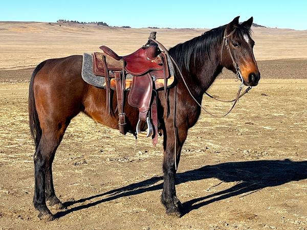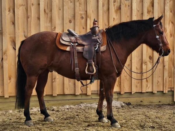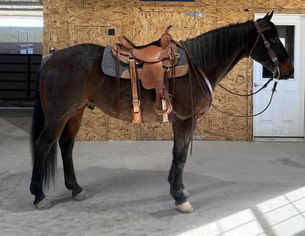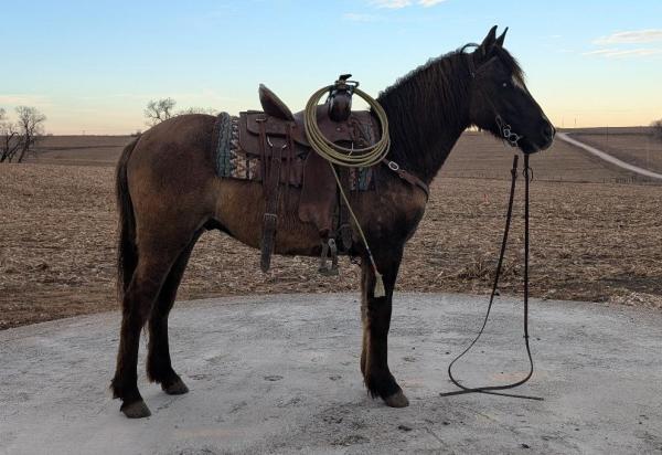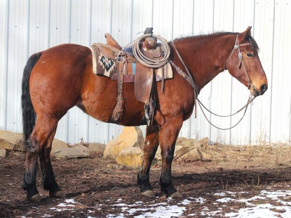 "Gypsy" 2020 Bay Percheron X Q.H. Mare that stands 16 hands. She is gentle and broke for anyone to ride, side passes to ... | HIP #36 2014 Bay Q.H. Gelding